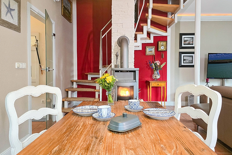 Das Haus ist hell, freundlich und modern eingerichtet. Maritime Akzente sorgen für ein angenehmes Urlaubsgefühl, während der Kaminofen an kühleren Tagen für Gemütlichkeit sorgt. Dank WLAN bleibst Du auch im Urlaub bestens vernetzt. Besonders praktisch: Es gibt zwei Stellplätze direkt am Haus sowie einen abschließbaren Fahrradraum, in dem Fahrräder sicher abgestellt werden können. Das Ferienhaus ist ein Nichtraucherhaus. Auch Haustiere sind in diesem Objekt nicht gestattet.