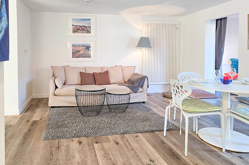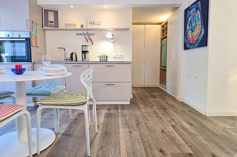 Die Ferienwohnung ist hell und freundlich gestaltet – mit klaren Linien, modernen Möbeln und maritimen Akzenten. Im offenen Wohnbereich kannst Du es Dir auf dem Sofa gemütlich machen oder gemeinsam essen. Die voll ausgestattete Küche bietet alles, was Du für den Alltag brauchst. WLAN steht kostenlos zur Verfügung. Haustiere sind in dieser Wohnung erlaubt. Ein Kinderreisebett und ein Hochstuhl sind ebenfalls vorhanden – perfekt für Familien mit Baby oder Kleinkind.
